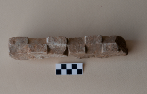 Coppia di frammenti della medesima cornice decorata, con motivo a cubetti giustapposti in calcare bianco