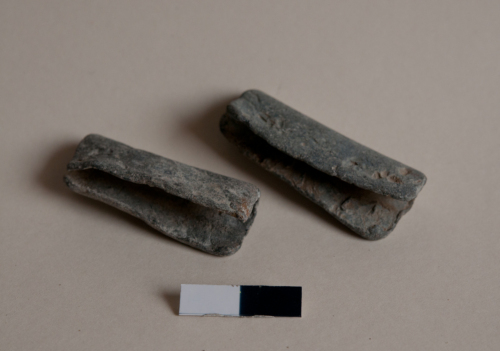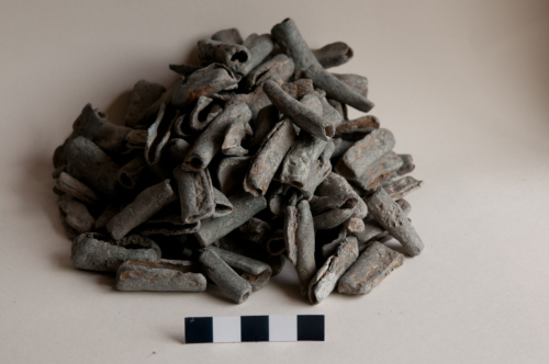Gruppo 112 di pesi di piombo di medie dimensioni, si tratta di fascette rettangolari con in media misure di 2,5-3,5 x 3.4 cm. Questo tipo di pesi erano saldati lungo il bordo delle reti, a distanze regolari, per facilitare il movimento in acqua.