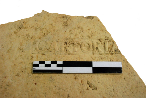Laterizio con bollo entro cartiglio rettangolare, con lettere a rilievo disposte su un rigo, che riportano il termine Cartoriana.