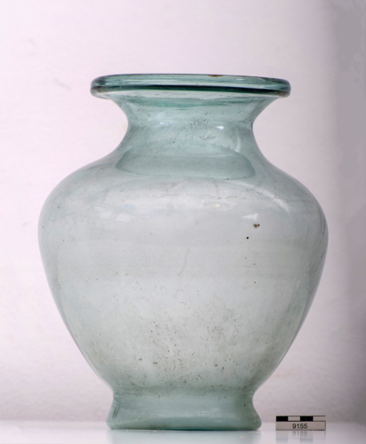 Olla con orlo estroflesso, labbro ispessito e piegato verticalmente per alloggiare il coperchio, basso collo troncoconico a profilo convesso, corpo ovoidale con spalla pronunciata, piede troncoconico ricavato dalla parete, cavo all'interno. Vetro a colorazione naturale verde/azzurro, trasparente.