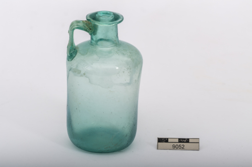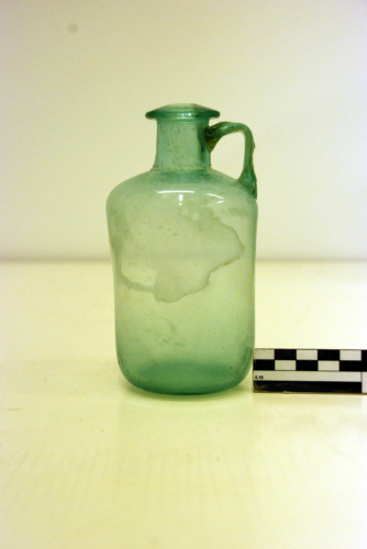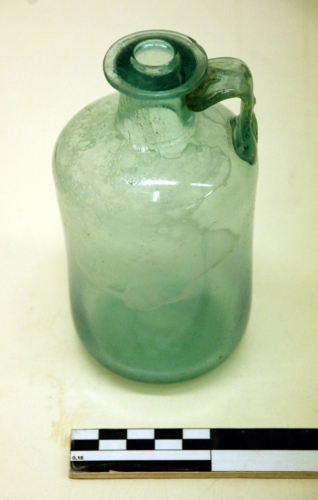 Bottiglia con orlo orizzontale ribattuto, leggermente pendente, breve collo cilindrico a profilo lievemente concavo, spalla convessa, ansa a due nervature, piegata a squadra, corpo cilindrico, base concava. Vetro a colorazione naturale verde/azzurro trasparente.