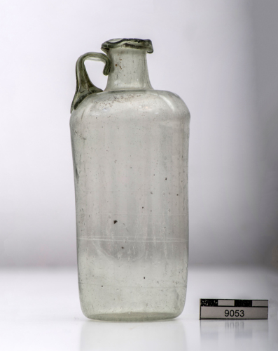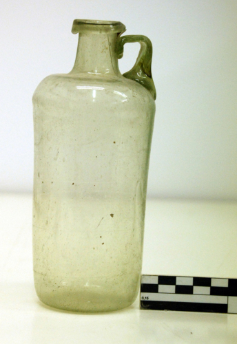 Bottiglia con orlo ripiegato a collarino a sezione trinagolare, breve collo cilindrico a profilo lievemente concavo, ansa a due nervature, piegata a squadra, spalla convessa, corpo cilindrico, base piana; sei sottili linee a mola incise orizzontalmente sul ventre. Vetro grigio/verde, trasparente.