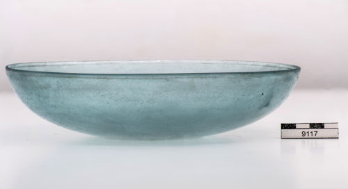 Coppa con orlo indistinto con labbro tagliato e levigato a mola, vasca larga e profonda, con base leggermente concava. All'interno sul fondo un cerchiello inciso tra due cerchi concentrici, all'esterno un sottile solco sotto l'orlo. Vetro azzurro, traslucido e spesso.