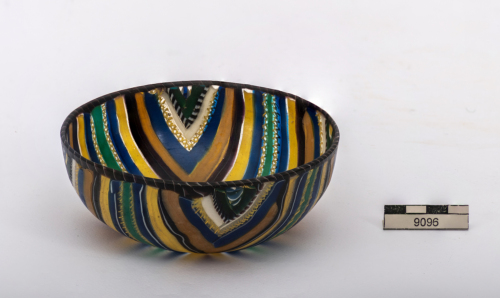 Coppa con orlo indistinto con labbro arrotondato, costituito da una canna applicata di colore porpora con filamento ritorto bianco opaco; vasca a basso profilo emisferico realizzata a mosaico a nastri accostati disposti secondo lo schema a quadranti. Due nastri verdi disposti a croce con una tessera a mosaico composito nel punto di incontro definiscono i quadranti, campiti da fasce angolate di dimensioni decrescenti che si susseguono fino all'orlo secondo un ordine fisso: una canna incolore con filamento ritorto giallo opaco, una fascia blu e una gialla, un filo bianco, una fascia viola scuro con riga bianco opaco in mezzo, una fascia giallo scuro, una blu, una canna incolore con filamento ritorto giallo opaco, una fascia bianca, una canna ritorta blu e bianco opaco, una fascia verde e infine un piccolo triangolo di colore giallo, blu e bianco. Vetro incolore, blu, giallo e viola trasparente e bianco e giallo opaco.