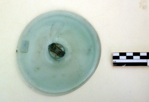 Coperchio con orlo tagliato e arrotondato, con profilo piatto e presa cilindrica con terminazione biforcuta.