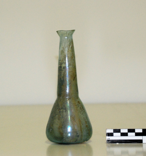 Balsamario con orlo estroflesso, tagliato e arrotondato, con lungo collo rastremato verso l'alto, con corpo conico e base piana.