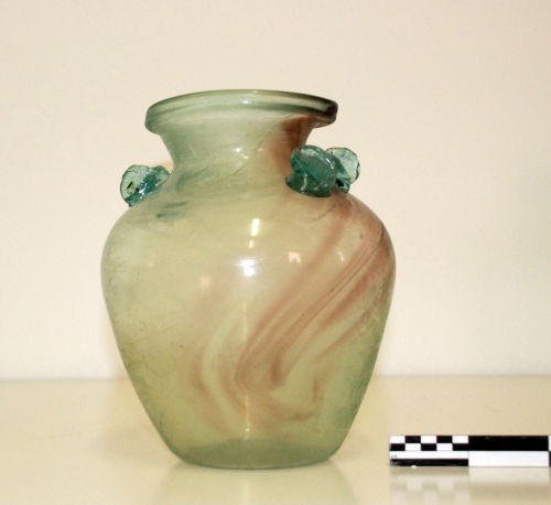 Olla con orlo verticale ribattuto, breve collo a gola, anse a omega impostate sulla spalla; corpo ovoidale con spalla tondeggiante e base concava.