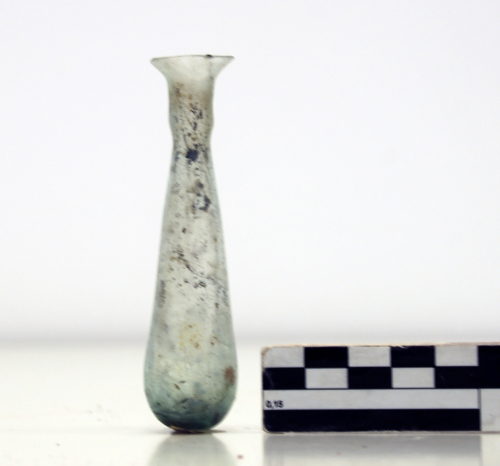 Balsamario con ampio orlo svasato, tagliato e arrotondato, breve collo leggermente rigonfio, sottolineato alla base da una lieve strozzatura, corpo tubolare rastremato verso l'alto e piccola base appiattita.