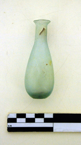 Balsamario con orlo svasato, tagliato e arrotondato, breve collo cilindrico, sottolineato alla base da una lieve strozzatura, corpo piriforme allungato e piccola base leggermente concava.