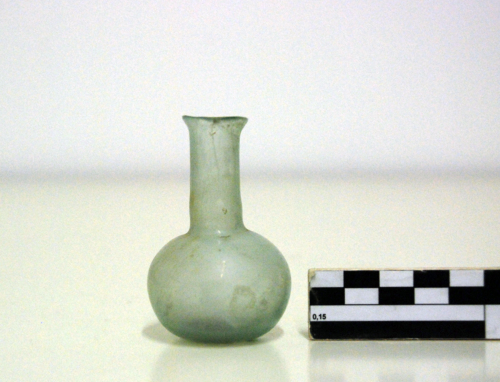Balsamario con orlo estroflesso, tagliato e arrotondato, con breve collo sottolineato da una strozzatura, con corpo sferoidale e piccola base piana.
