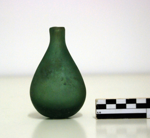 Balsamario con orlo orizzontale ribattuto, lungo collo cilindrico, sottolineato alla base da una strozzatura, con corpo piriforme arrotondato e base piana.