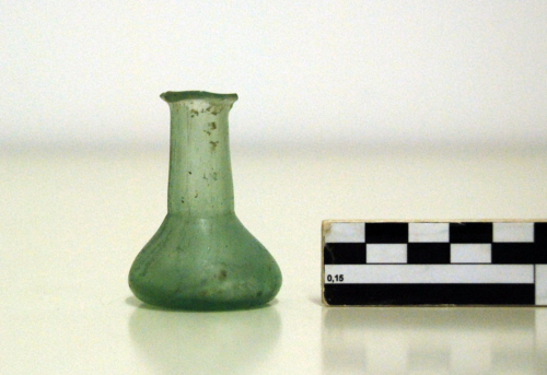 Balsamario con orlo svasato, tagliato e arrotondato, tozzo collo cilindrico, sottolineato alla base da una lieve strozzatura, corpo conico campaniforme e base leggermente concava.