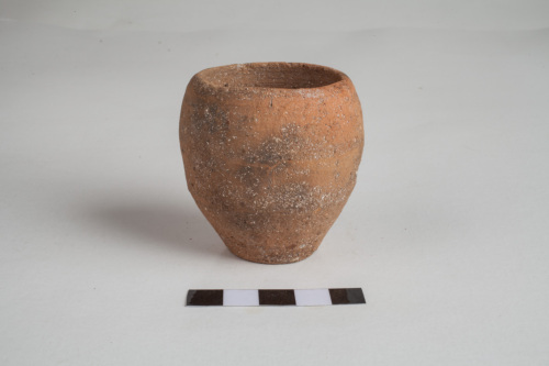 Olletta miniaturistica con base di appoggio piana e corpo ovoidale; orlo leggermente rientrante con labbro assottigliato; impasto semidepurato di colore rosso, ricco di minuti inclusi; superfici lisciate e ingubbiate di colore rosso