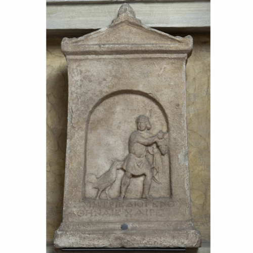 La stele ha forma vagamente trapezoidale e culmina in un timpano decorato da tre acroteri di cui quello centrale possiede maggiori dimensioni rispetto ai due laterali. Nella parte centrale della stele si trova una nicchia dalla base rettangolare e dalla sommità ad arco. In essa è raffigurato un giovane, ritratto nell'atto di allontanare un grappolo d'uva da un gallo. Il corpo del giovinetto si inclina infatti in direzione opposta all'animale, protendendo le braccia verso la sua sinistra, mentre con la testa si volge a destra verso il volatile. Indossa un corto chitone, stretto da una cinta e una clamide. Al di sotto della nicchia si trovano due righe di testo, relative all'iscrizione funeraria.