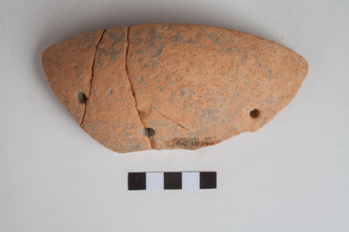 frammento di coppa con corpo a profilo emisferico; orlo superiormente appiattito e ispessito internamente; argilla semidepurata di colore arancio; piede ad anello svasato; superfici lisciate. Sulla superficie esterna sono presenti tracce di pittura rossa. Sono presenti tre fori di riparazioni antichi.