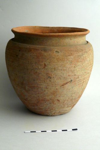 orlo estroflesso leggermente ingrossato distinto da un gradino, spalla decorata da una fascia di linee parallele incise, parete arrotondata, fondo piano indistinto