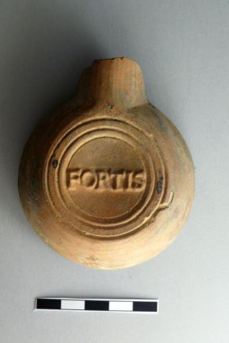 - NOTIZIE STORICO CRITICHE Il marchio Fortis è presente già a Pompei e Vindonissa ed è attestato per tutta l'età romana, poiché compare ancora in stratigrafie di V secolo. Si tratta del marchio di gran lunga più diffuso in tutte le regioni del Mediterraneo, tranne la Grecia. La produzione iniziale è da collocare nell'Italia settentrionale, forse in Emilia, nel modenese, ma per il periodo seguente è difficile mettere a fuoco il flusso commerciale delle lucerne e distinguerlo da quello delle matrici con le quali, in località diverse , venivano realizzate imitazioni