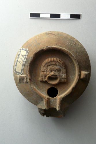 due borchiette sulla spalla, disco molto ribassato con foro di alimentazione decentrato verso il becco e mascherone tragico centrale, per il quale cfr. una lucerna marchiata Litogenes da Aquileia (Buchi 1975, tav. XL, 845)
