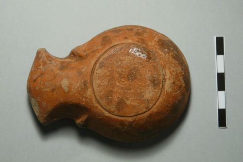 becco angolare con volute laterali, serbatoio troncoconico rovesciato, spalla piana distinta mediante una solcatura dal disco concavo decorato al centro da un ramo di quercia ad una foglia (Balestrazzi 1988, motivo IV.d.1.1-2); fondo piano delimitato da una circonferenza incisa