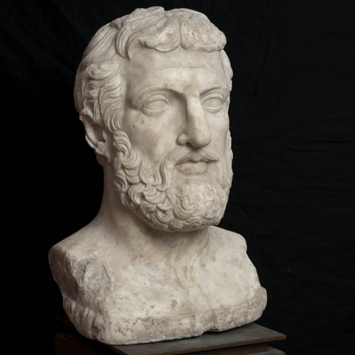 Il ritratto raffigura un uomo in età matura, caratterizzato dalla presenza di capelli radi sulle tempie, dei folti baffi e della barba, resa con riccioli vezzosi. Il viso possiede un ovale pieno, in cui però il modellato lascia trasparire la struttura ossea sottostante: si colgono infatti gli zigomi e le marcate arcate soppraccigliari, che si trovano al di sotto di una fronte ampia e solcata da rughe. Gli occhi sono a mandorla, velati dalle palpebre che in parte ne coprono l'arco superiore. Il busto si presenta nudo.