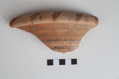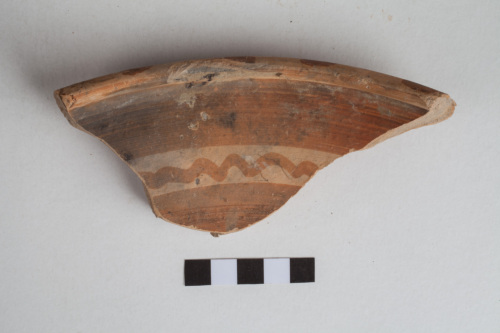 frammento di orlo con orlo pendulo pertinente ad una coppa; la decorazione è realizzata con pittura rossa e riveste la superficie esterna; in corrispondenza dell'orlo sono presenti una serie di tacche oblique e parallele; la superficie interna, sempre decorata in rosso, presenta una fascia risparmiata all'interno della quale è presente un motivo ondulato; impasto depurato, superfici lisciate
