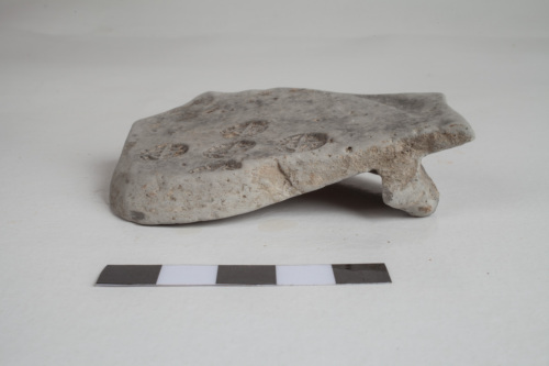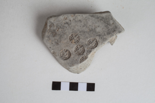 frammento di fondo pertinente ad una coppa in ceramica grigia con base ad anello svasato ; nella parte interna e in corrispondenza del fondo sono presenti 5 impressioni realizzate a stampo; impasto depurato, superfici lisciate di colore grigio