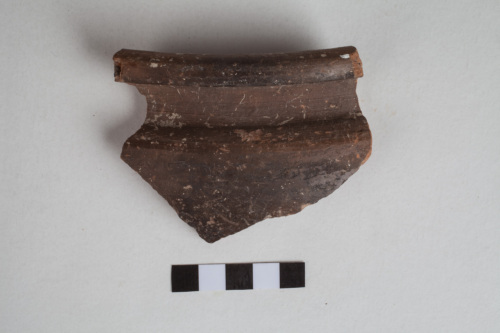 frammento di orlo pertinente ad un vaso situliforme con orlo distinto e labbro arrotondato, breve collo troncoconico, spalla carenata e arrotondata; impasto depurato, superfici esterna steccata, interna lisciata