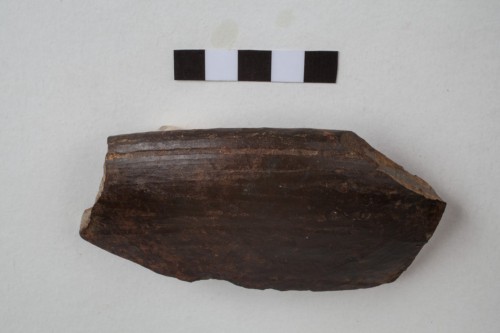 frammento di orlo diritto con labbro arrotondato pertinente ad una coppa, sottolineato esternamente da una solcatura orizzontale; impasto mediamente depurato a componente micacea di colore grigio, superfici steccate di colore marrone scuro