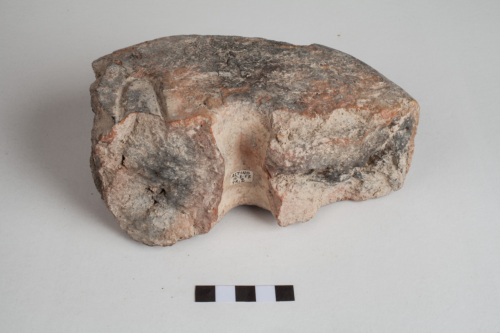 frammento di grande peso di forma circolare con foro centrale a sezione circolare; su una delle due facce è presente un segno curvilineo; impasto semi-grossolano di colore grigio-rossiccio; superfici rozzamente lisciate