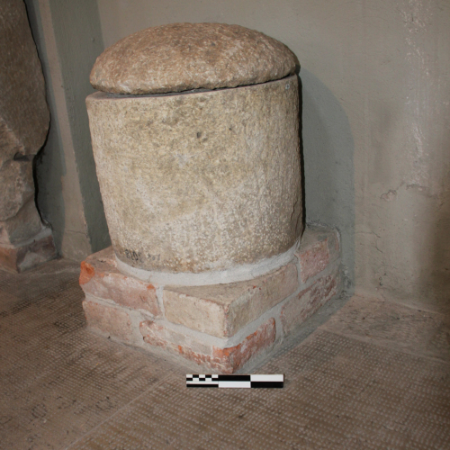 L'urna ha forma cilindrica ed è stata realizzata lavorando a scalpello un blocco di calcare delle cave di Aurisina. E' completa di coperchio, che è leggermente più piccolo rispetto all'urna (2 cm). E' anepigrafe.