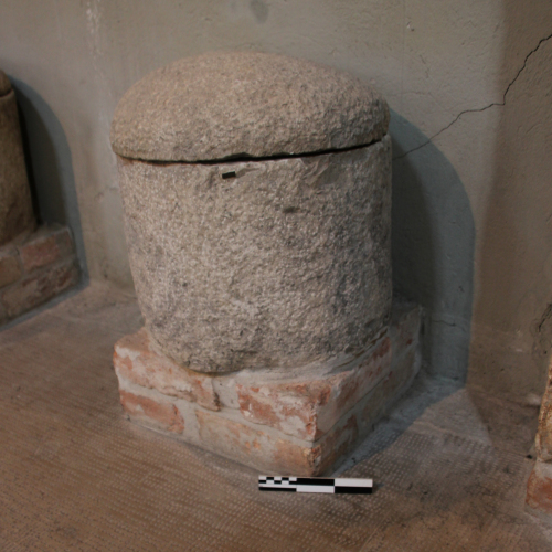 L'urna ha forma cilindrica ed è stata realizzata lavorando a scalpello un blocco di calcare di Aurisina, poi levigato. E' completi di coperchio. Si presenta anepigrafe.