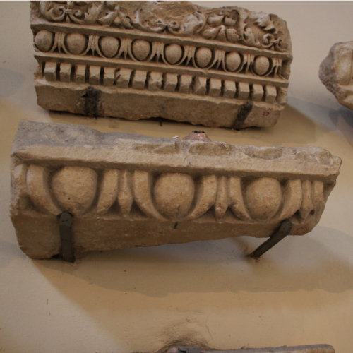 Il frammento di decorazione, realizzata in marmo, raffigura una teoria di ovoli, racchiusi in gusci, che sono separati da lancette stilizzate.