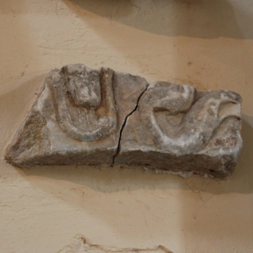 Il frammento di decorazione architettonica è stato realizzato lavorando a scalpello una lastra di marmo di grandi dimensioni. Il rilievo raffigura un motivo sinuoso, forse dei racemi non meglio definibili.