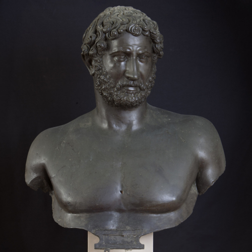 L'opera raffigura un uomo maturo. Il volto, dall'ovale pieno, è rivolto verso sinistra. Esso è caratterizzato dalla presenza di una folta acconciatura, con riccioli chioccioliformi scomposti che aderiscono però alla calotta cranica, senza scostarsene troppo e da una ricca barba che si unisce ai baffi ai lati della bocca. Il viso è contrassegnato dai marcati tratti fisiognomici: si individuano una fronte ampia, solcata da rughe, al di sotto della quale si notano arcate soppraccigliari quasi rettilinee e grandi occhi, dall'espressione vagamente malinconica. Il naso è diritto, la bocca ha labbra sottili. Il busto è nudo.
