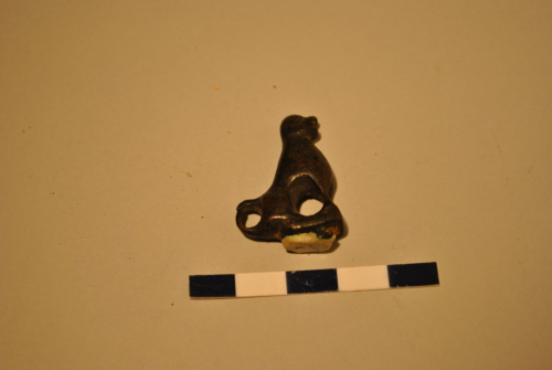 Statuetta di animale(scimmia). Tra le zampe anteriori vi è un foro passante.