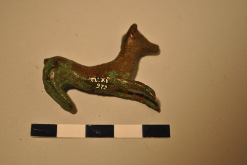 Maniglia conformata a cane in atto di saltare. Il muso è appuntito; le orecchie sono aguzze. Le zampe anteriori sono protese in avanti; quelle posteriori sono unite in un unico blocco.