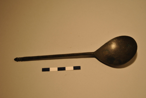 Cucchiaio con conca tondeggiante. Stelo poligonale terminante in due globetti e una pigna.