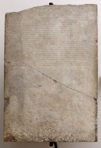 - NOTIZIE STORICO CRITICHE La stele fu rinvenuta nel 1788 da parte dello spagnolo Antonio de Torres y Ribera a Portogruaro, nella casa del canonico Quirini, ove era riutilizzata come davanzale di una finestra. In seguito alla sua rimozione, la stele fu donata nel 1790 al nobile veneziano Pietro Persico, i cui eredi la donarono nel 1828 al Museo. La stele, insieme ad altre due iscrizioni sempre di provenienza cretese, costituisce un'importante testimonianza documentaria sulle complesse dinamiche politiche che interessarono l'isola di Creta durante il periodo medio e tardo-ellenistico (secc. III-II a.C.), altrimenti scarsamente noto a causa delle rare fonti letterarie disponibili. Durante questo periodo, Creta è oggetto di numerose tensioni interne, in cui spesso intervengono le grandi potenze ellenistiche (Egitto, Macedonia, regno Seleucidico, Pergamo, Sparta e infine la stessa Roma): la struttura agraria e sociale arcaica, l'incremento demografico e la scarsità delle risorse inducono i singoli centri a costituire vere e proprie confederazioni di città, alleandosi con le poleis più potenti, come Gortina e Cnosso, nel tentativo di affermare le proprie spinte espansionistiche; nascono pertanto numerosi trattati di alleanze che stabiliscono attività offensive e difensive e definiscono in modo preciso i confini territoriali per ciascun centro.