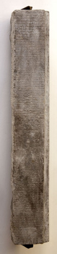 stele parallelepipeda opistografa (scritta su entrambi i lati), lavorata a gradina lungo i lati, ove a circa metà altezza si identifica un foro circolare.