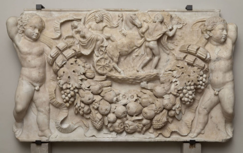 - NOTIZIE STORICO CRITICHE Numerosi interventi di restauro interessano i due putti, ma soprattutto i protagonisti della scena mitologica, di cui sono state integrate quasi tutte le parti anatomiche. Il rilievo costituiva la parte destra di un sarcofago a ghirlande, la cui produzione seriale inizia a partire dalla fine del regno di Traiano o al massimo dall'inizio di quello di Adriano. Spesso, per decorare le lunette delle ghirlande, venivano impiegate scene figurate a soggetto dionisiaco o con episodi tratti dal mito. La maggior parte dei rilievi concepiti in questo modo si datano al II sec. d.C. e precedono i sarcofagi decorati a fregio per l'intera lunghezza della cassa. Il rilievo di Venezia è tra i primi rilievi a destinazione funeraria che raffigurano il mito di Proserpina. Sulla base di queste considerazioni, accanto ad altre di tipo stilistico-formale, è stata proposta una datazione relativa ai primi decenni del regno di Adriano.