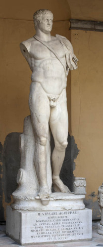 Statua colossale di M. Vipsanio Agrippa, ritratto in posizione stante sopra una base ovale modanata, nudo a eccezione della piccola clamide indossata sulla spalla sinistra; l'impostazione classica del corpo, ispirato al modello del Doriforo policleteo, contrasta con la testa che invece spicca per il suo carattere di notevole individualità. La testa, a struttura rettangolare, è rivolta verso sinistra, secondo un movimento accentuato dalla torsione del collo; il volto appare appesantito e ingrassato, con le sopracciglia incombenti sugli occhi, mentre la linea delle labbra e del mento sono meno incisive. L'acconciatura dei capelli è costituita da ciocche ondulate, aderenti alla calotta cranica, che sulla tempia sinistra e sulla sommità della nuca presentano una scriminatura meno obliqua. Sopra la base modanata, sono collocati anche un tronco d'albero sul quale gravita il peso della gamba destra e un altare cilindrico di minute proporzioni. La base è collocata sopra un plinto parallelepipedo che riporta un'iscrizione latina moderna.