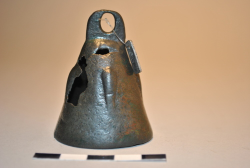 Tintinnabulum di forma campaniforme, con base circolare deformata, decorato da quattro tacche a goccia rilevate. Piccola presa piatta con foro passante oblungo. Manca il batacchio.