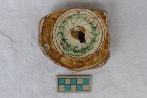 Probabile piatto ingobbiato, graffito e invetriato internamente. La superficie esterna presenta tracce di invetriatura che scendono fino al piede. Presenta vasca troncoconica e piede ad anello. Sulla vasca si sviluppa una decorazione graffita con medaglione includente un motivo floreale stilizzato. Si notano grossi vacuoli e lo stacco del treppiede di cottura sul cavetto.