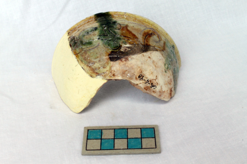 Scodella con vasca a profilo campaniforme. La superficie interna è ingobbiata, graffita e dipinta sotto vetrina. Il decoro è costituito da tralci fitomorfi, alternati a cerchi tagliati in croce, sulle pareti della vasca e da un motivo stellato al centro del cavetto. Anche la superficie esterna è ingobbiata, graffita e dipinta sotto vetrina con decorazione a tralci fitomorfi alternati a cerchi tagliati in croce. Sul cavetto si rilevano i segni lasciati dallo stacco del treppiede di cottura.