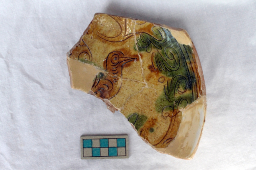 Vasca con profilo emisferico e piede ad anello. La superficie interna è ingobbiate, graffita e dipinta sotto vetrina piombifera incolore. Il decoro graffito, marcato da pennellate di colore giallo e verde, è costituito da un volatile rivolto a destra entro tralci fitomorfi. La superficie esterna è ingobbiata fino al piede (tranne il fondino) e invetriata solo poco sotto l'orlo.