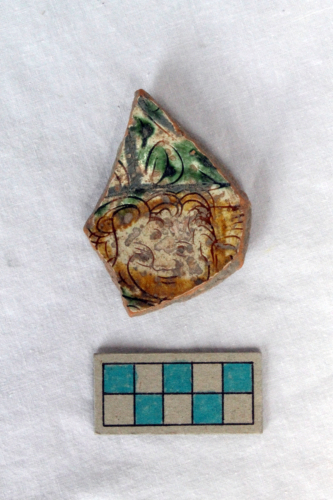 Scodella con piede ad anello e vasca a profilo emisferico. La superficie interna è ingobbiata, graffita e dipinta sotto vetrina; la superficie esterna è ingobbiata e invetriata fino al piede con risparmio del fondino. Il decoro graffito è costituito da un cherubino con capelli dipinti in giallo, tra spiralette marcate da pennellate di colore verde.