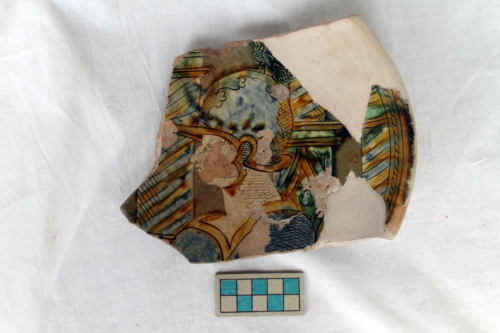 Piatto scodellato di cui si conserva una breve vasca emisferica, orlo estroflesso assottigliato, basso piede ad anello. La superficie interna è ingobbiata, graffita a fondo ribassato e dipinta in giallo, blu e verde sotto vetrina piombifera incolore. La superficie esterna è ingobbiata fino al piede con fondino a risparmio e invetriata fino a metà vasca. Il decoro mostra un guerriero con elmo, di profilo verso sinistra, su fondo a motivi architettonici. Sono visibili i segni di stacco del treppiede di cottura.