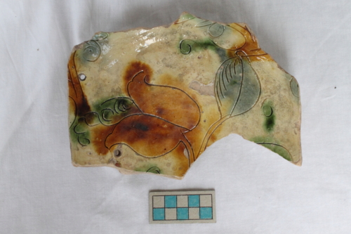 Bacino con vasca troncoconica e piede ad anello. La superficie interna è ingobbiata, graffita e dipinta in giallo, verde e blu, sotto vetrina piombifera incolore. La superficie esterna è ingobbiata e parzialmente invetriata. Il decoro graffito è costituito da un fiore tra motivi fitomorfi stilizzati. Si rileva la presenza di due piccoli fori circolari passanti in prossimità di un settore della frattura (fori di restauro, mentre sulla superficie esterna si notano grossi vacuoli.