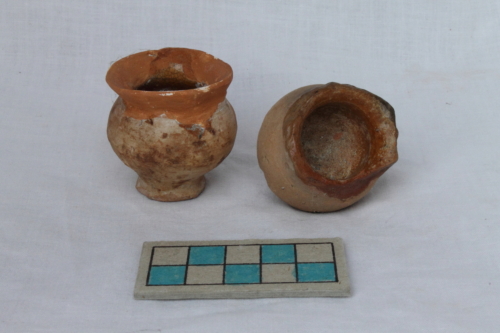 Due vasetti portaspezie con alto piede a disco, corpo globulare, breve collo, orlo estroflesso e labbro arrotondato. La superficie interna del vasetto A è ingobbiata e invetriata in marrone, mentre quella esterna è ingobbiata e parzialemente invetriata. La superficie interna del vasetto B è ingobbiata e invetriata in marrone, mentre il rovescio non è rivestito. Si rilevano sulle superficie non rivestita del vasetto A delle colature di vetrina e sul fondo i segni di stacco dal tornio per strozzatura della cordicella.