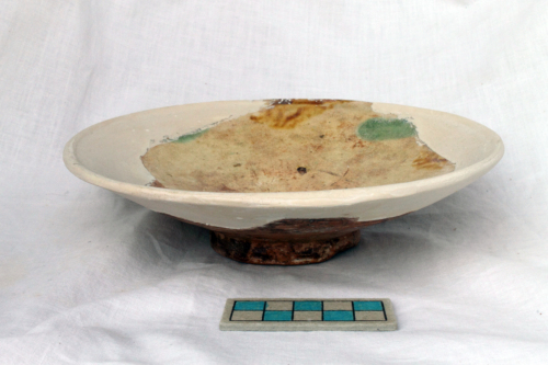 Piattello con piede ad anello umbonato, vasca troncoconica, orlo indistinto e labbro sagomato. La superficie interna è ingobbiata e dipinta sotto vetrina piombifera incolore, mentre il rovescio non è rivestito. Il decoro dipinto è costituito da una fascia, sotto l'orlo, campita da sequenza di pennellate alternativamente di colore giallo e verde. Sul cavetto sono visibili i segni lasciati dallo stacco del treppiede di cottura.